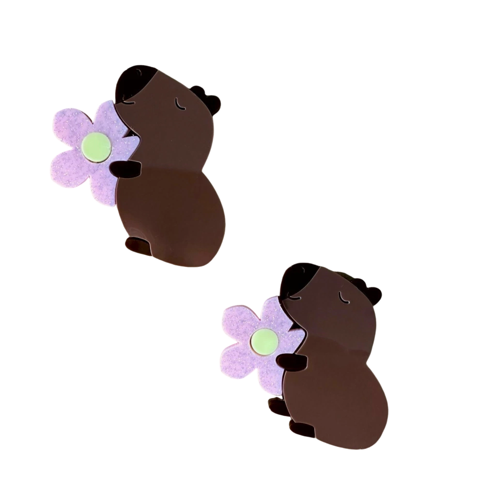 Aplique Capivara Flor Rosa Claro Glitter Curvado (6cm) Acrílico - 2 Unidades