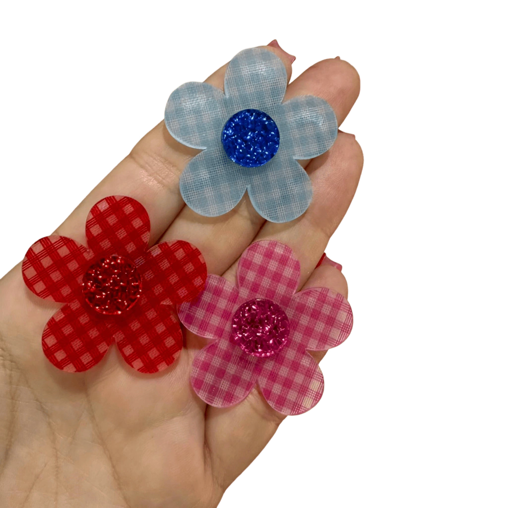 Aplique Flor Xadrez Miolo Glitter (4 cm) Acrílico - 2 Unidades