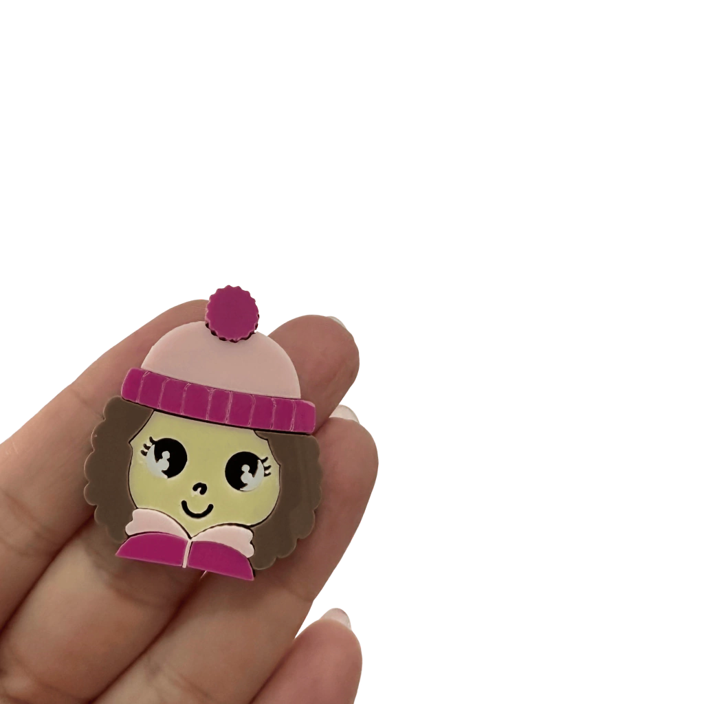 Aplique Menina Touca Rosa e Pink (4cm) Cabelo Castanho Acrílico – 2 Unidades