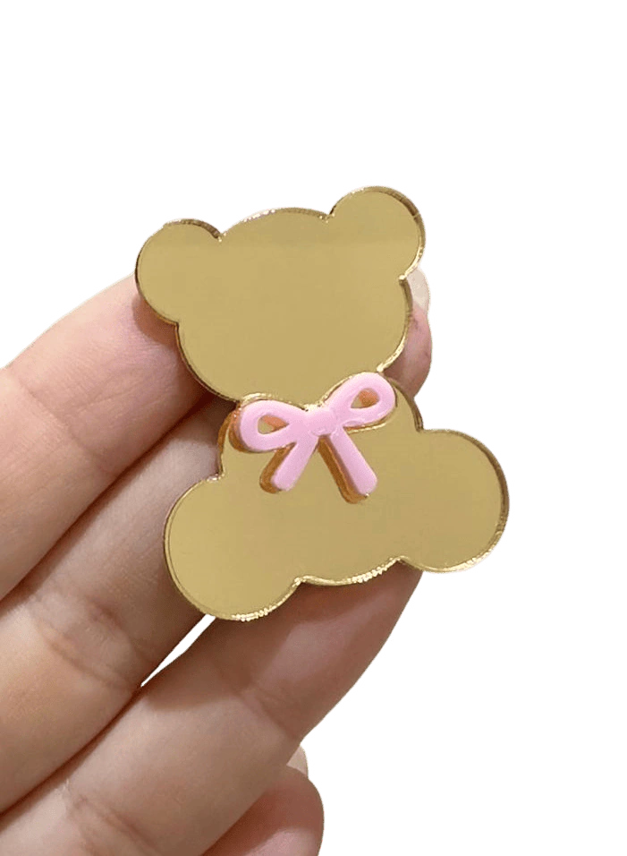 Aplique Ursinho Espelhado Dourado (3cm) com Laço Rosa Acrílico – 2 Unidades