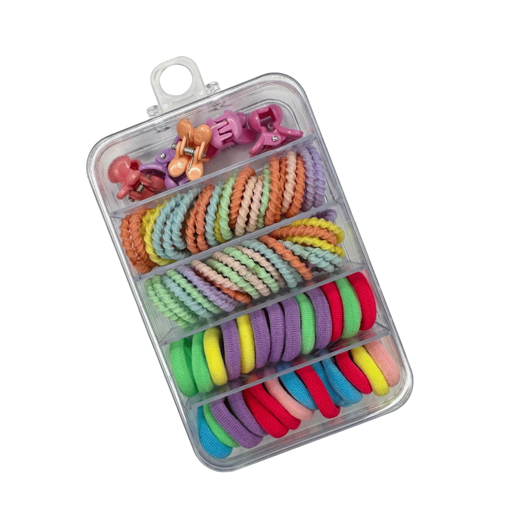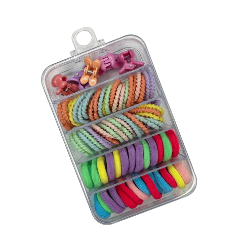 Perfeita para quem busca praticidade e estilo na hora de arrumar os cabelos, esta caixinha reúne aproximadamente 70 elásticos de cabelo (2cm) e 5 mini presilhas em cores sortidas claras, ideal para diversas ocasiões.